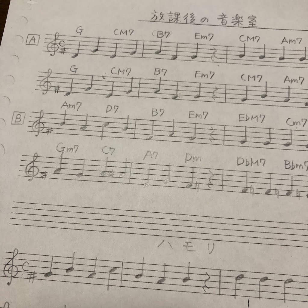 ゴンチチの「放課後の音楽室」をギター&ウクレレアンサンブルで演奏する予定ですが、シンプルなメロディの曲なので、アレンジしようと思います。