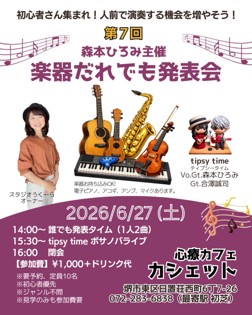 誰でも参加できる「楽器だれでも発表会」と「ティプシータイムライブ」 14時 ¥1,000
